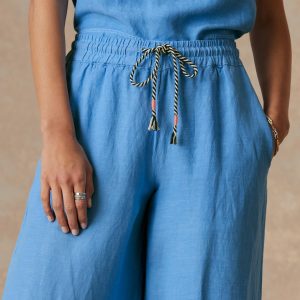 These breezy. wide-leg pants have a drawstring waist with rope tie. Linen/rayon. Dry clean. Made in USA. Sizes XS (0-2). S (4-6). M (8-10). L (12-14). XL (16-18). 30 inseam. 12rise. 15 leg opening.