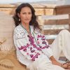 Such a pretty sweater. with floral embroidery placed at front and sleeves. a jewel neckline. long rib cuffs. a high rib hem and dolman sleeves for a feminine shape. Mercerized wool/nylon. Hand wash. Imported. Exclusive. Sizes XS (0–2). S (4–6). M (8–10). L (12–14). XL (16–18). XXL (20–22). Approx. 24l.