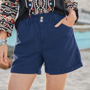 The most utilitarian shorts in your suitcase now updated for extra style. Paper-bag elastic waist. coconut buttons. zipper fly and rolled cuff hem. Cotton/linen. Machine wash. Imported. Exclusive. Sizes 2?C16. 5 inseam.