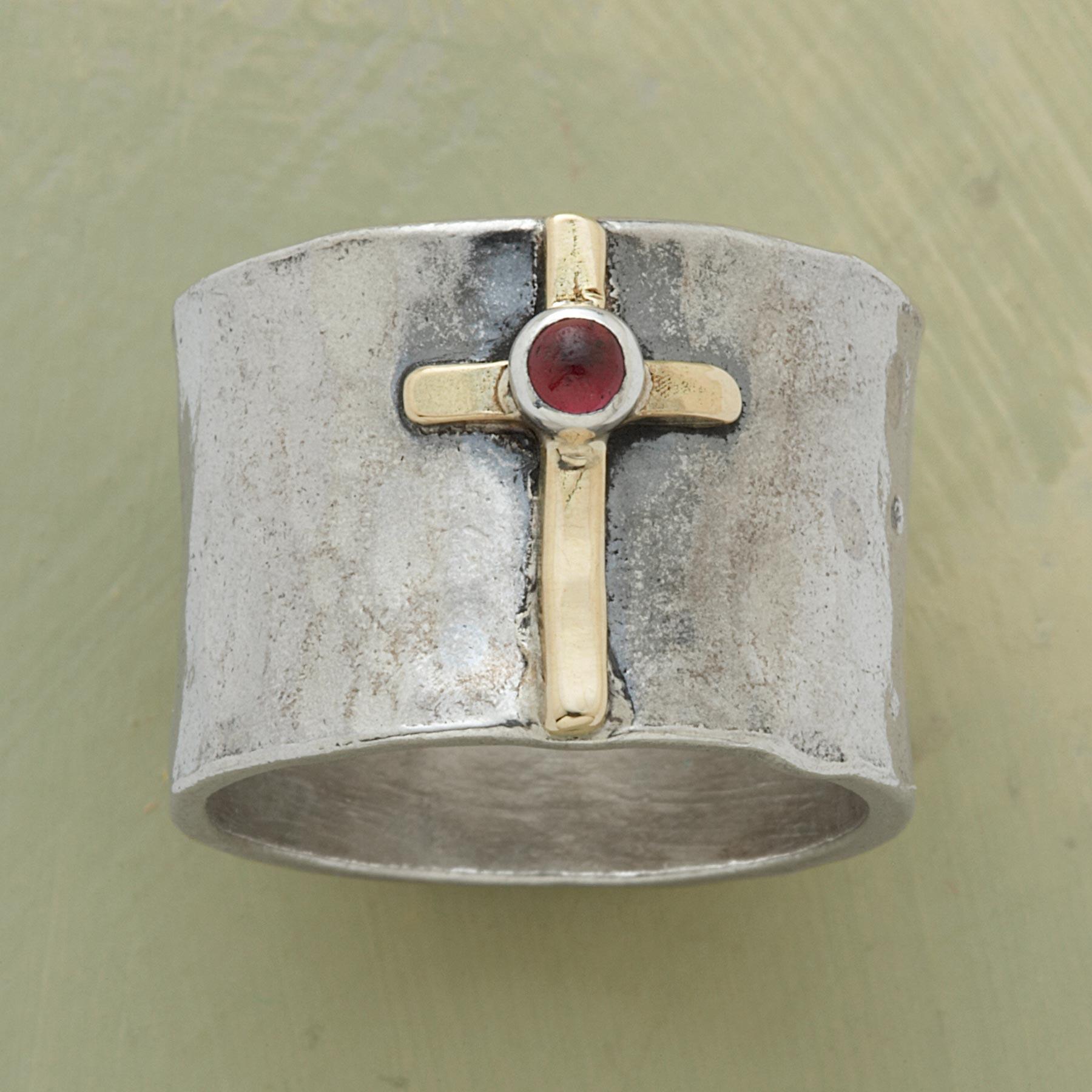 A 14kt gold cross bears a garnet cabochon set upon a hand-hammered sterling silver band. Whole and half sizes 5-9.5. 5/8w.