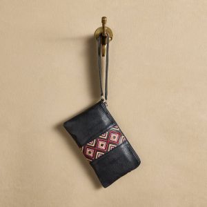 Handcrafted in small batches by skilled craftspeople. the Chamiso Zippered Pouch is made of full-grain leather embellished with embroidered ribbon. Chic and compact. with a wristlet strap. it carries your phone. cards and cash in style. Zip top. one interior pocket and four card slots. Imported. Approx. 8l x .5d x 4.5h.