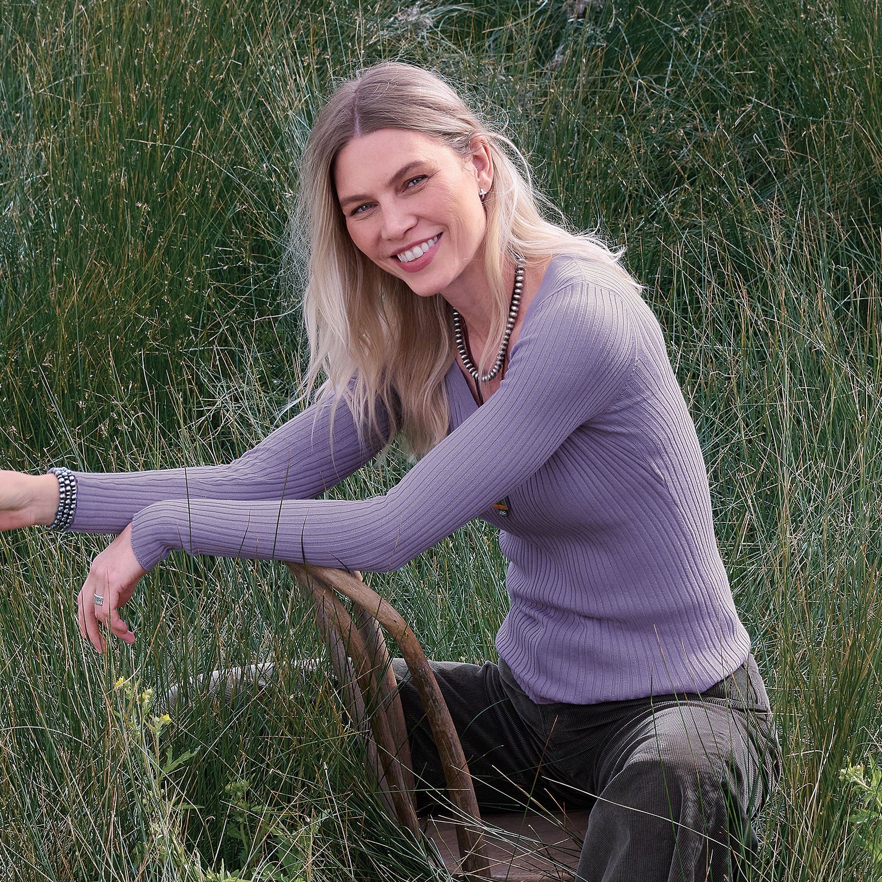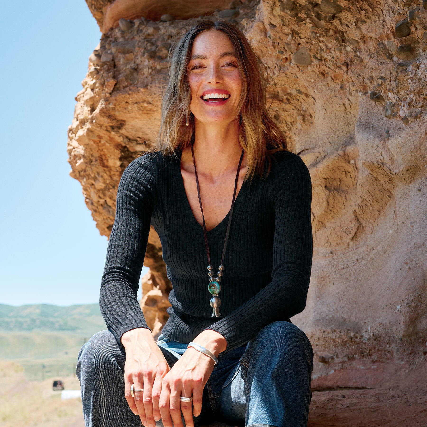 Simple and sophisticated. our fitted. mixed rib stitch sweater. in Lightest Legends yarn. V-neck. Cotton/nylon/spandex. Machine wash. Imported. Exclusive. Sizes XS (0?C2). S (4?C6). M (8?C10). L (12?C14). XL (16?C18). XXL (20?C22). Approx. 24l.