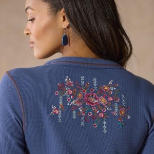 Lovely. multicolored floral and geometric embroidery graces our fitted. notch neck henley with contrast stitching detail. rib trim and princess seams. Metal buttons. Cotton. Machine wash. Imported. Exclusive. Sizes XXS (00). XS (0?C2). S (4?C6). M (8?C10). L (12?C14). XL (16?C18). Approx. 24l.