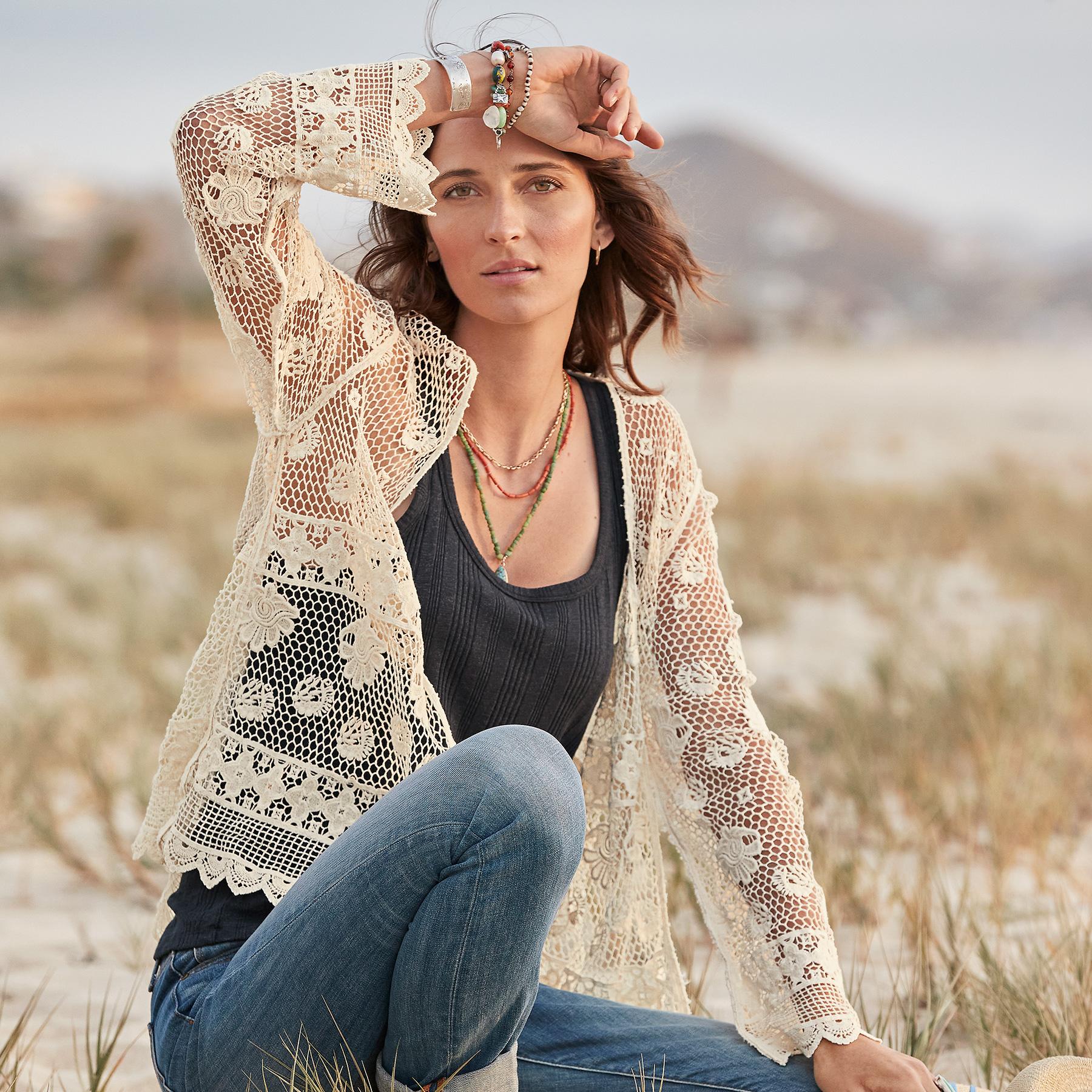 Beautiful floral details add a feminine touch to our open kimono. light and airy in lace with scalloped hem and cuff. A versatile essential to dress up or down for any occasion. Cotton. Hand wash. Imported. Exclusive. Sizes XXS (00). XS (0?C2). S (4?C6). M (8?C10). L (12?C14). XL (16?C18). Approx. 23.5l.