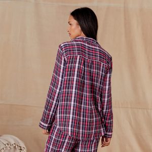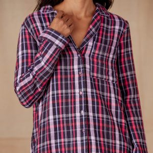 Soft and feminine plaid pajama top sure to delight with fabric covered buttons down the front. one patch pocket and lace trim detail. Hi-lo hem. Cotton. Machine wash. Imported. Exclusive. Sizes XS (0-2). S (4-6). M (8-10). L (12-14). XL (16-18). XXL (20-22). Approx. 25.5l.