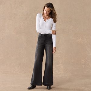Stretchy. five-pocket styling with dramatic wide legs that grace the ankles. Cotton/spandex. Machine wash. Imported. Sundance exclusive. Sizes 24?C32. 30. 32 or 34 inseam. 11 rise. 26 leg opening.