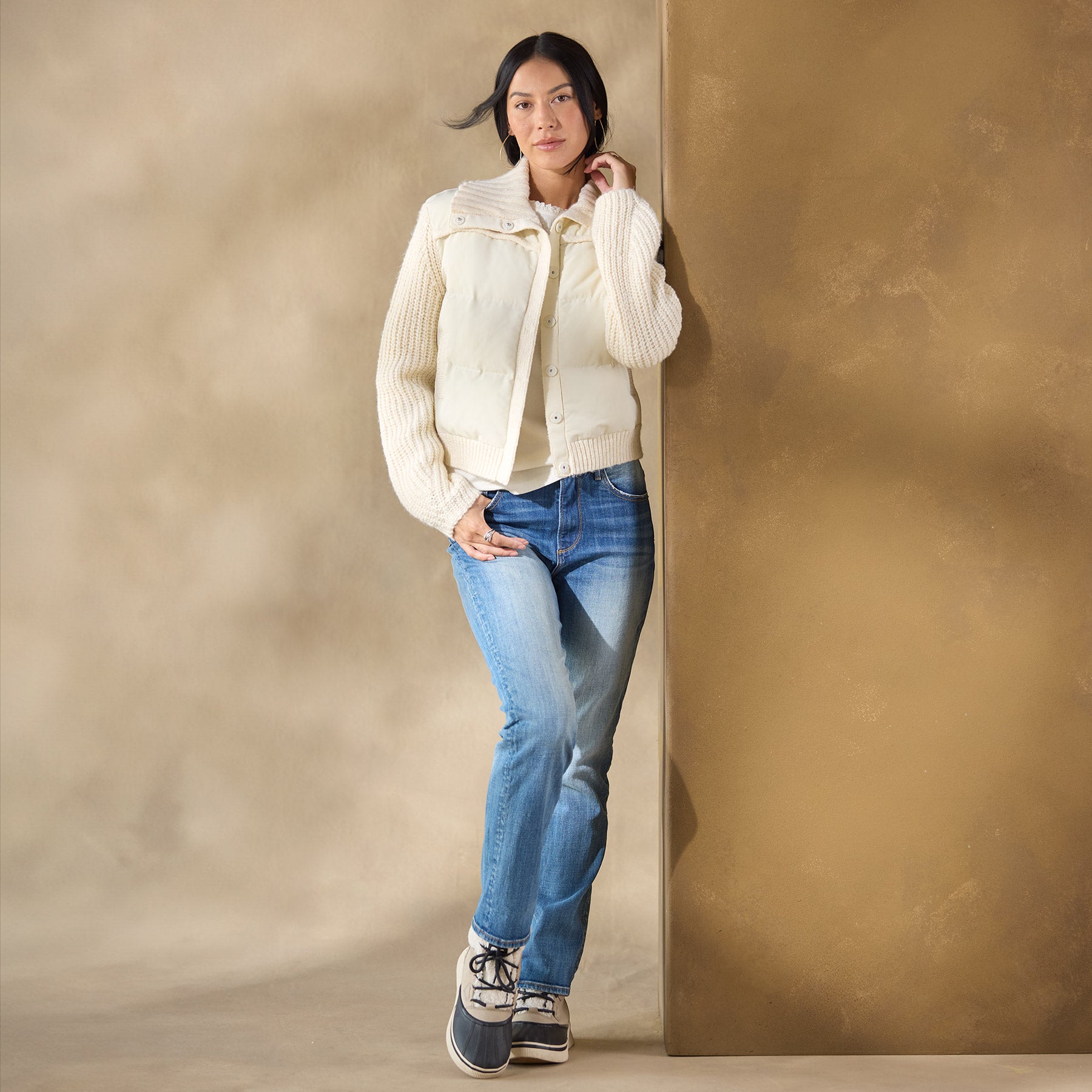 A quilted puffer meets cozy sweater in this delectable. vintage-vibe jacket. The front body and yoke are puffy coat style and the sleeves. trim and back are rib sweater. With button-through mock neck. snap front. exposed seaming and two pockets. Cotton/acrylic/merino wool/alpaca. Hand wash. Imported. Exclusive. Sizes XXS (00). XS (0–2). S (4–6). M (8–10). L (12–14). XL (16–18). Approx. 19l.