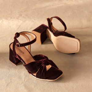 These handcrafted heels feature a velvet knotted upper. covered heel. adjustable strap. square toe and leather lining. Viscose/Cupro. Italy. Exclusive. Whole sizes 36 (US 5.5). 37 (US 6). 38 (US 7). 39 (US 8). 40 (US 8.5). 41 (US 9.5). Approx. 2.25 heel.