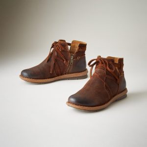 Step up to the ruggedly chic look of these ultra-comfortable. suede chukkas with crisscross. leather laces over cutaway sides and extra-flexible rubber and cork soles. suede/leather/rubber/cork. By Born. Imported. Whole and half sizes 6-10. 11. 1 heel. These boots are running a 1/2 size small.