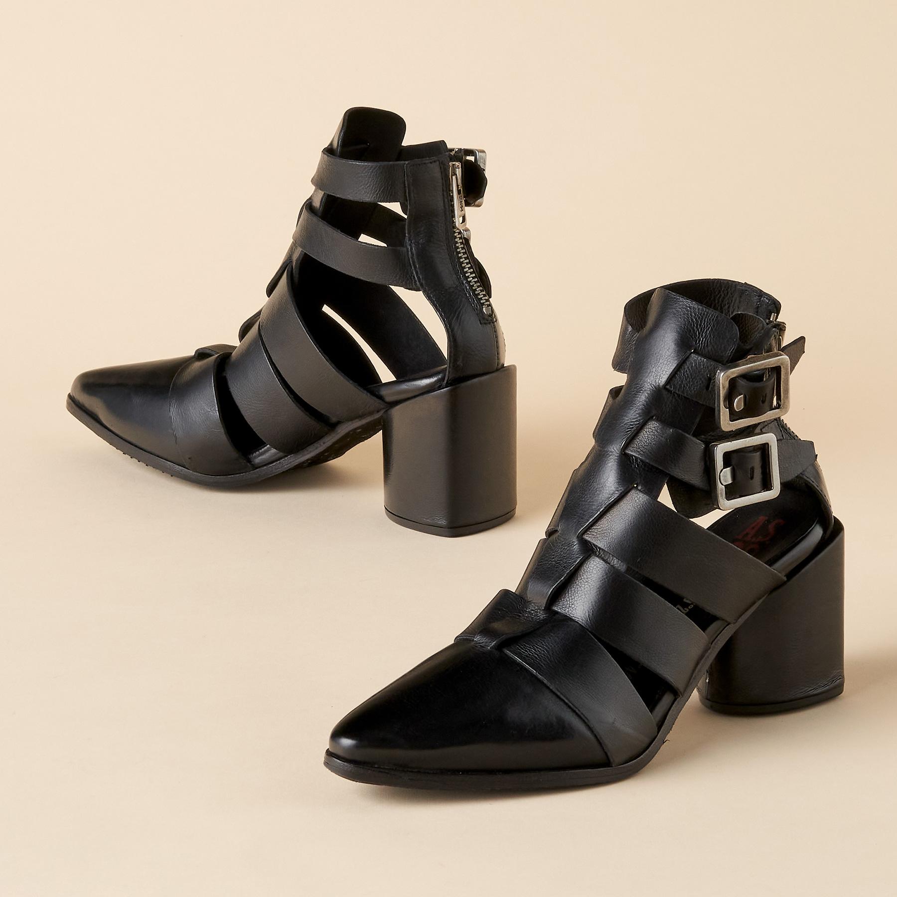 These sumptuous booties have an open style with a closed toe and feature a multi-strap design. back zip and double. adjustable buckles. Leather. Imported. Euro whole sizes 36-42. 36 (US 5.5-6). 37 (US 6.5-7). 38 (US 7.5-8). 39 (US 8.5-9). 40 (US 9-9.5). 41 (US 9.5-10). 42 (US 10.5-11). 3 heel.